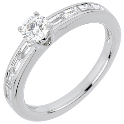 Een solitairee diamant is opgenomen in een luxe frame bezet met geslepen `baguette` diamanten.