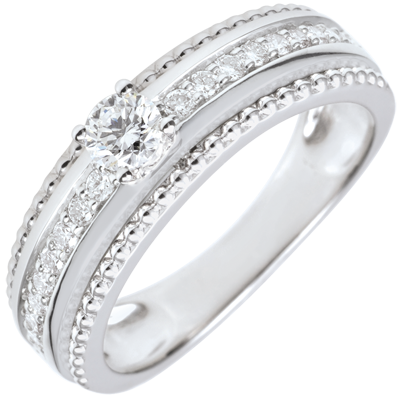 Een solitairee diamant wordt ondersteund door twee rijen van gouden parels die een diamanten ring omlijsten. Een ring die een schitterende en elegante vrouwelijkheid uitstraalt