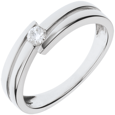 De witgouden ringen spelen met hun vorm die een symmetrische diamanten solitaire omlijsten