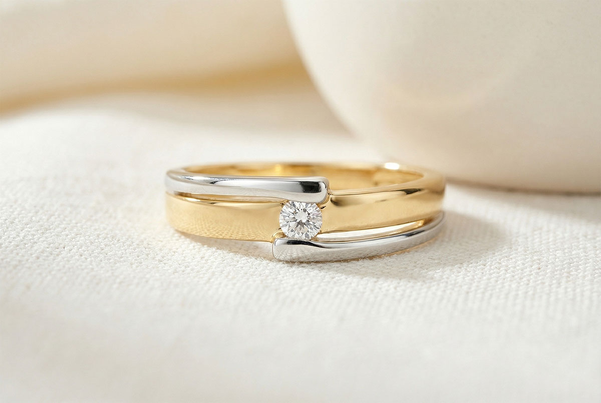 Een geelgouden ring wordt omhelsd door twee witgouden armen met diamanten.