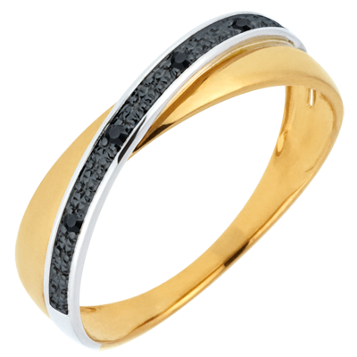 Een geelgouden ring gekruist met een witgouden ring bezet met zwarte diamanten.