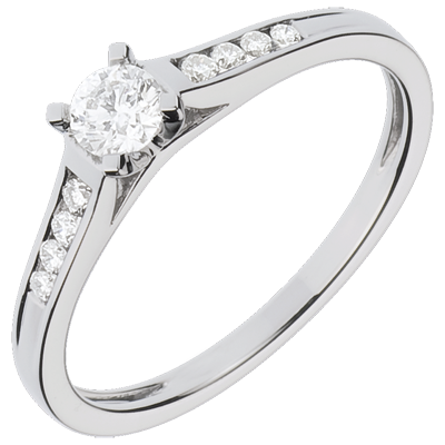De essentie van een solitaire in witgoud, gemarkeerd met een briljant gevolg. Een delicaat en tijdloos frame.
