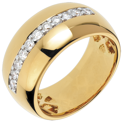 Luxueus en licht, eenvoudig en elegant als deze brede geelgouden ring geplaveid met diamanten.