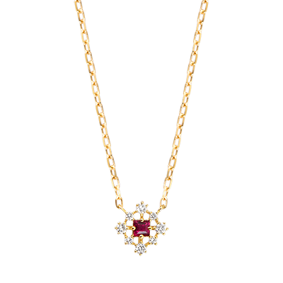 Een intense vierkante robijn in het midden van een opengewerkt motief, omringd door acht fonkelende diamanten.Een grafisch en verfijnd sieraad – de perfecte balans tussen kracht en elegantie.