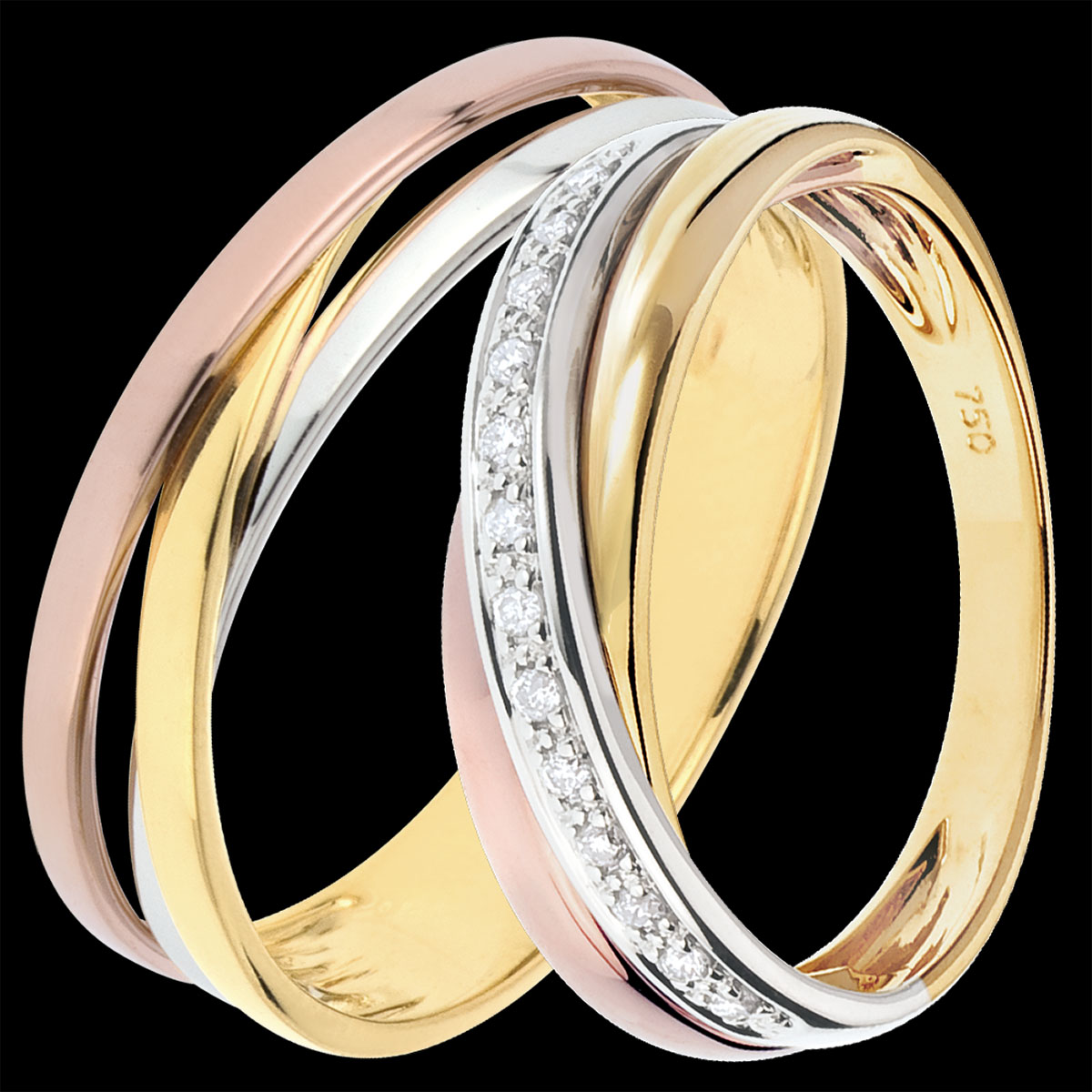 Een elegant paar trouwringen voor haar & hem. Voor haar: een uitgebalanceerd ontwerp in drie goudsoorten, met een pavé van diamanten op witgoud. Voor hem: een trilogie van verstrengelde ringen in drie goudkleuren.