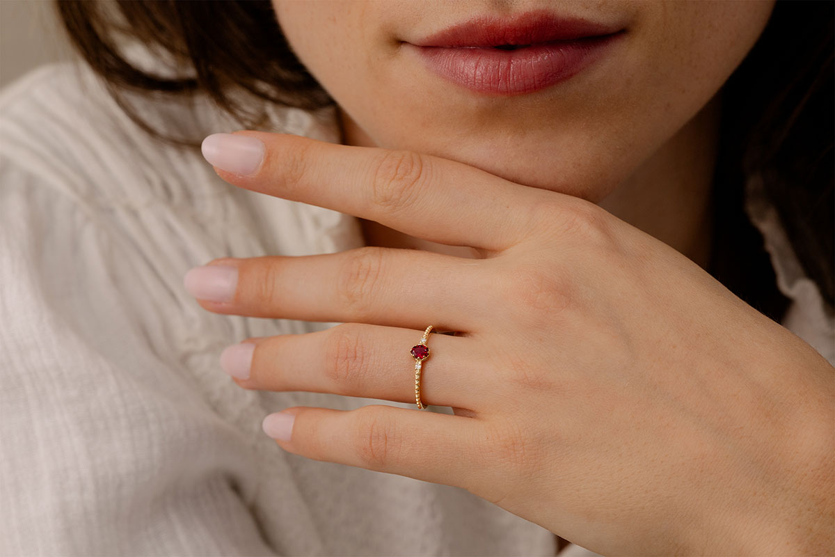 Een sprankelende robijn, geaccentueerd door twee schitterende synthetische diamanten op een verfijnd bewerkte ring.Een ring vol tederheid en kracht, als een belofte die zacht en vurig tegelijk is.