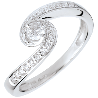De sensualiteit van een krullend frame betegeld met diamanten laat de centrale diamanten stralen.
