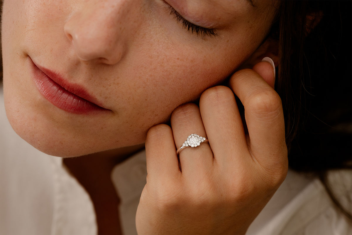 Een pavézetting van diamanten in de vorm van een bijenkorf die deze ring een zachte schittering schenken.