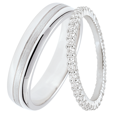 Een elegant paar trouwringen voor haar & hem. Voor haar een volledig rondom gezette ring met 38 diamanten van in totaal 0,57 karaat. Voor hem een witgouden ring met een stijlvolle geborstelde gouden strook.