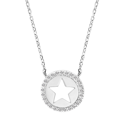 De Stellar-ketting heeft een uitgesneden ster in het midden van witgoud, omringd door sprankelende diamanten.