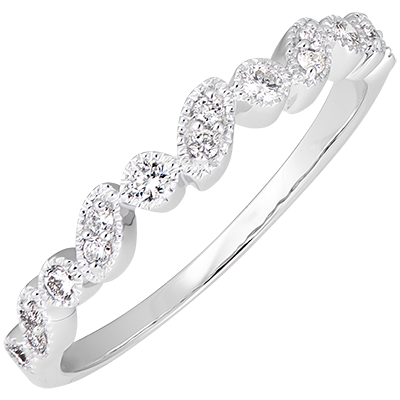 Een ring met ronde en amandelvormige bezettingen, die deze zetting lichtheid en speelsheid verlenen. Een model dat als trouwring of bij andere ringen gedragen wordt.