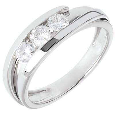 Een eenvoudig en klassiek frame gemarkeerd door een dubbele ring geopend op een diamanten trilogie.