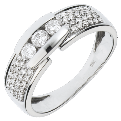 Een diamanten trilogie gekoesterd en rijkelijk geplaveid op een witgouden frame.