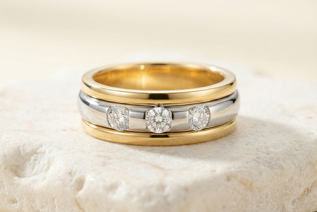 De fusie van de halve maan en de ring, bekroond met een diamanten trilogie, benadrukt door de kracht van een legering met twee goudsoorten.