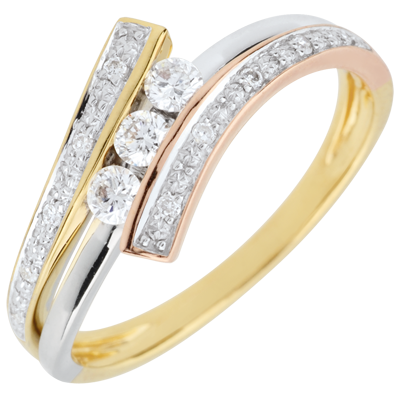 Drie goudsoorten rijkelijk vergezeld van een trilogie van diamanten voor elegantie en gratie.