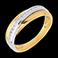 Een witgouden boog, bezet met 16 diamanten van kwaliteit HSI1 met een totaalgewicht van 0,16 karaat, omarmt de geelgouden band.