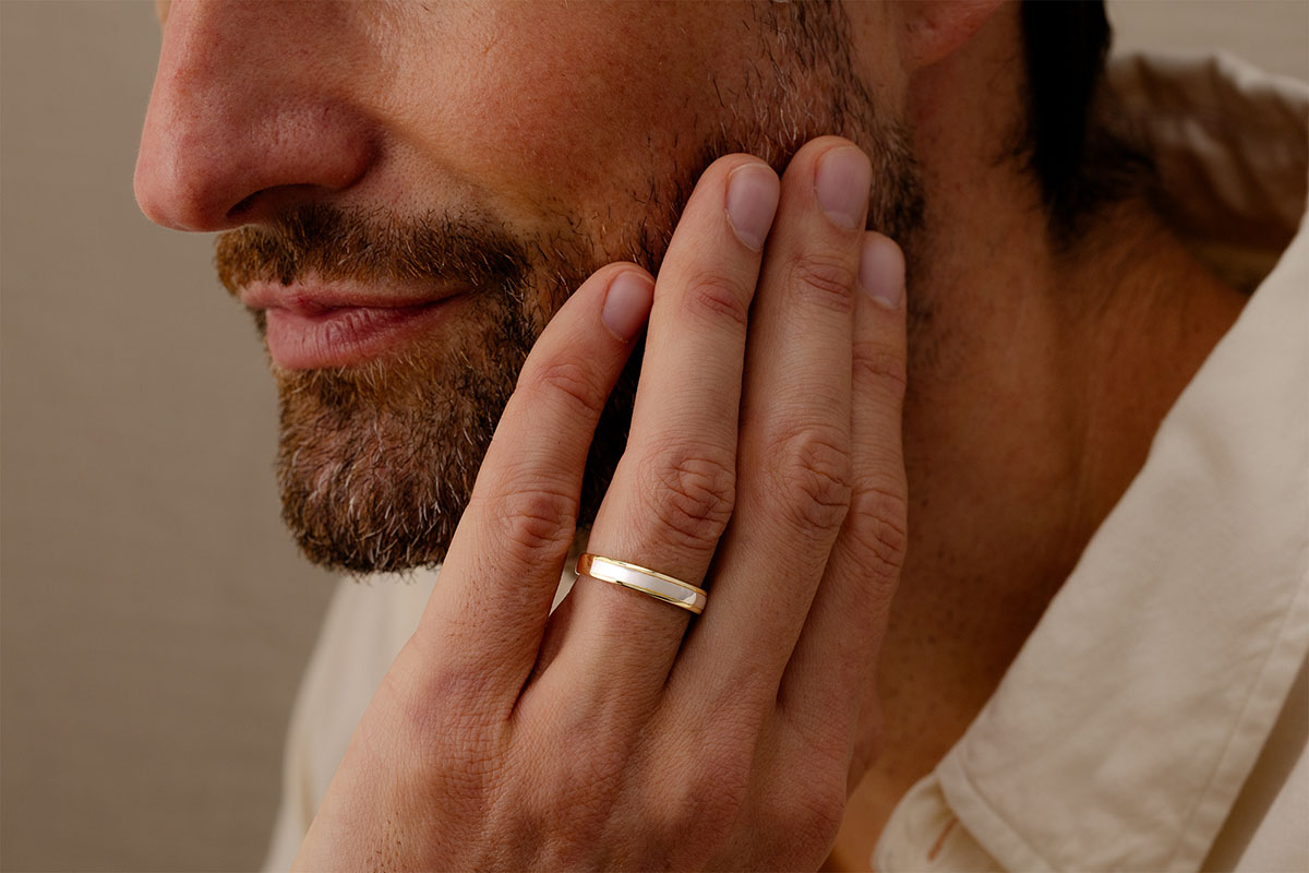 Een trouwring met een band en twee gouden linten in een horizontaal décor van klassiek en modern.
