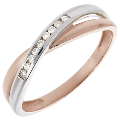 Een roségouden ring doorsnijdt een witgouden ring bezet met diamanten voor een strakke en moderne trouwring.