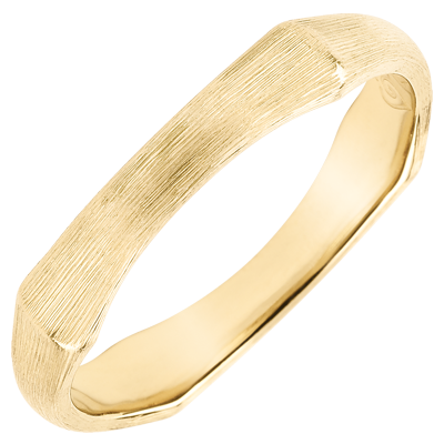 Een soepele en solide bamboetak geeft nu vorm aan een ring van geborsteld geelgoud voor een eeuwigdurend band. De afwerking met de hand van de matte afwerking geeft een natuurlijke uitstraling aan deze realistische uitvoering.