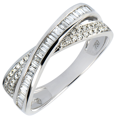 Een harmonische combinatie van 2 ringen, ondersteund door een pavézetting van briljant geslepen diamanten en staafdiamantjes.