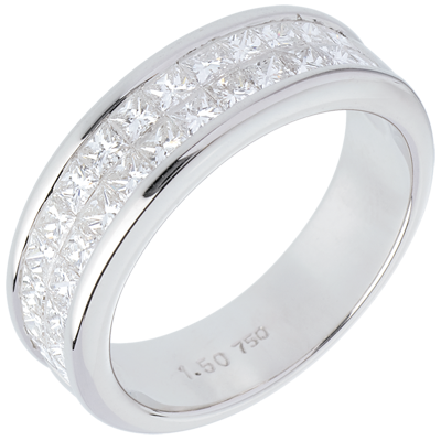 Een ring met vierkante doorsnede en halfronde pavézetting met 2 rijen geslepen diamanten.