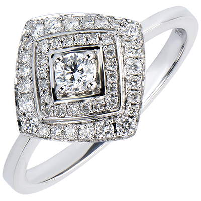 Een frame, geïnspireerd op de art-decostijl, grafisch en majestueus, met een centrale diamant opgeluisterd door een dubbele met diamanten bezette ruit. Een ring met stijl en karakter.