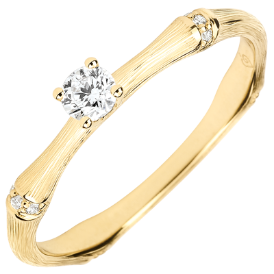 Een soepele en solide bamboetak geeft nu vorm aan een verlovingsring van geelgoud voor een eeuwigdurend band. De bamboeknopen zijn ingelegd met diamanten in het geel geborstelde goud om de solitairee diamant subliem laten uit te komen De afwerking met de hand van de matte afwerking geeft een natuurlijke uitstraling aan deze realistische uitvoering.
