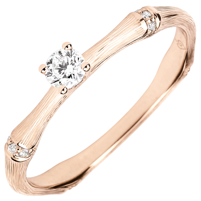 Een soepele en solide bamboetak geeft nu vorm aan een verlovingsring van roségoud voor een eeuwigdurend band. De bamboeknopen zijn ingelegd met diamanten in het roze geborstelde goud om de solitairee diamant subliem laten uit te komen De afwerking met de hand van de matte afwerking geeft een natuurlijke uitstraling aan deze realistische uitvoering.