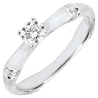 Een soepele en solide bamboetak geeft nu vorm aan een verlovingsring van witgoud voor een eeuwigdurend band. De bamboeknopen zijn ingelegd met diamanten in het witte geborstelde goud om de solitairee diamant subliem laten uit te komen De afwerking met de hand van de matte afwerking geeft een natuurlijke uitstraling aan deze realistische uitvoering.