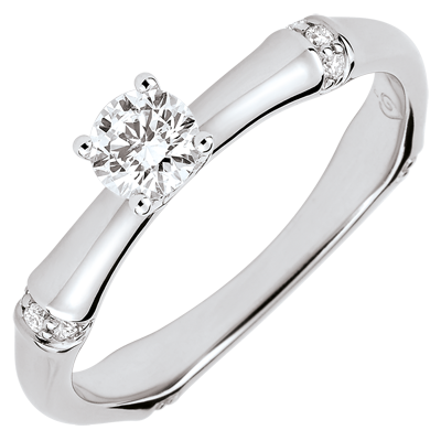 Een soepele en solide bamboetak geeft nu vorm aan een verlovingsring van witgoud voor een eeuwigdurend band. De bamboeknopen zijn ingelegd met diamanten in het witte goud om de solitairee diamant subliem laten uit te komen