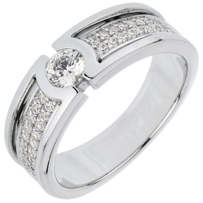 Een solitairee diamant is opgenomen in een subliem frame geplaveid met briljante diamanten