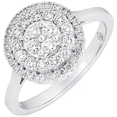 Een opgewerkte zetting met een concentrische bezetting van diamanten in de vorm van een romantisch sieraad. Een schitterende halo voor een edele, elegante ring.