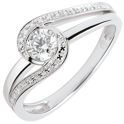 Een solitairee diamant neemt plaats op een gladde witgouden stroom en wordt liefdevol omarmd door een dubbele gouden boog, bewerkt op de wijze van diamant.