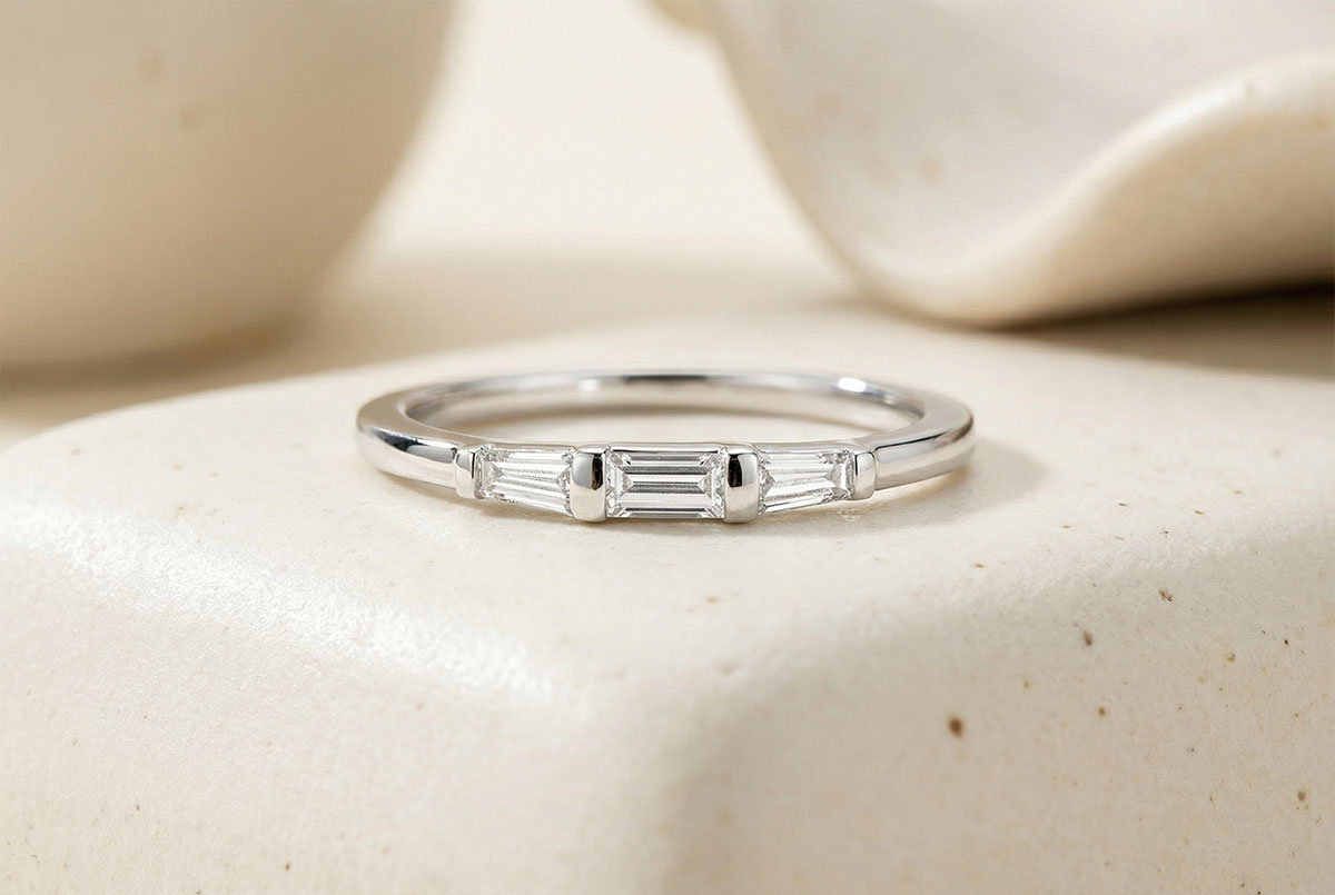 Een trilogie van staafdiamantjes met zuivere lijnen, een grote klassieker van de solitairee compleet.