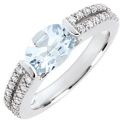 Deze verlovingsring in witgoud, modern en elegant, is voorzien van een aquamarijn die rijkelijk opgesierd wordt door een dubbele ring, bezet met diamanten.
