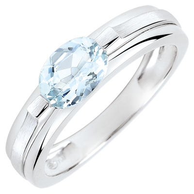 Deze verlovingsring in witgoud, modern en elegant, is voorzien van een Aquamarijn die rijkelijk opgesierd wordt door een dubbele ring