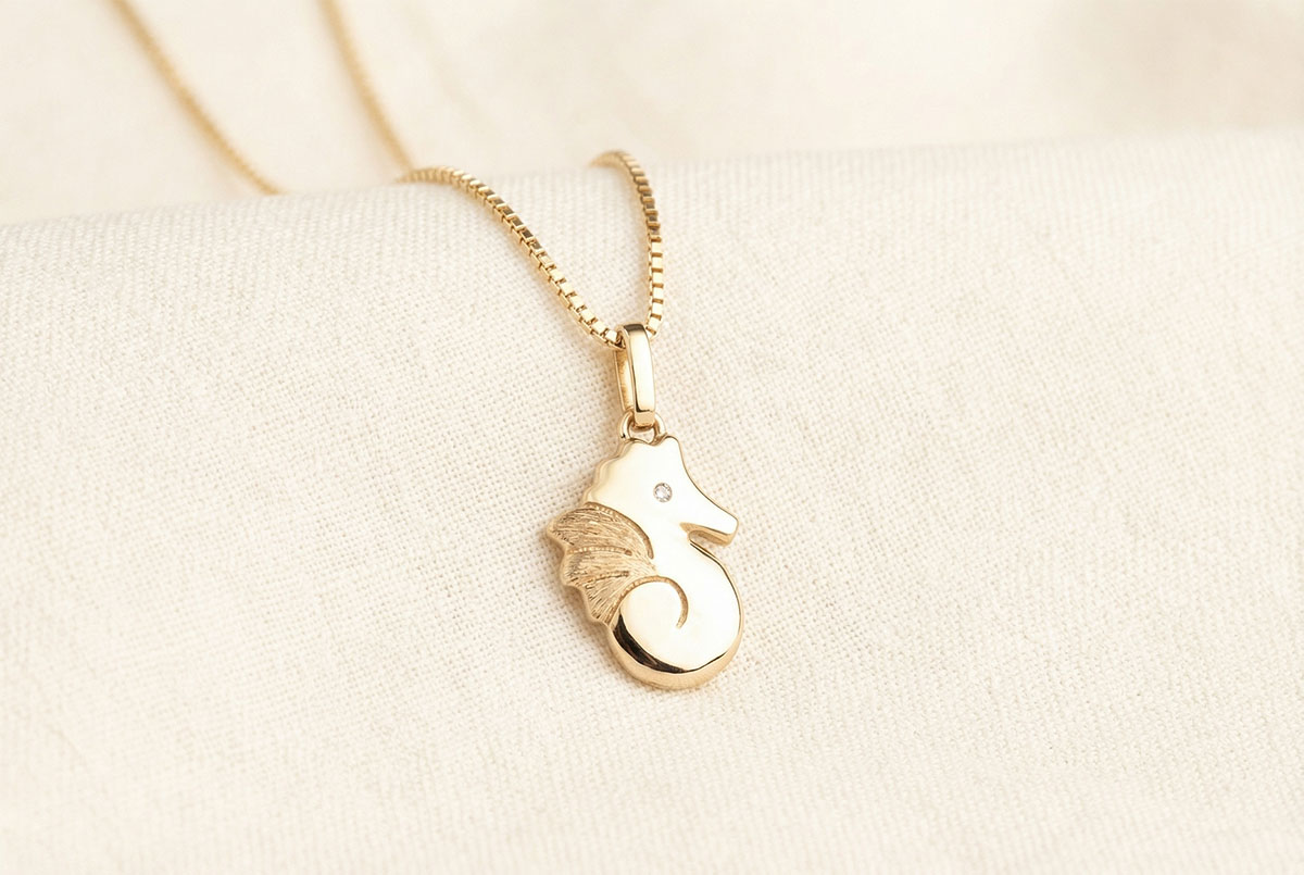Een klein zeepaardje in geelgoud is versierd met een diamanten oog. Groot model.
