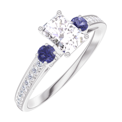 « L'ATELIER » NR. 160268Ring Witgoud 9 karaat - Diamant Rechthoekig 0.3 Karaat - Aanleunende edelstenen Blauwe saffier - Setting Diamant