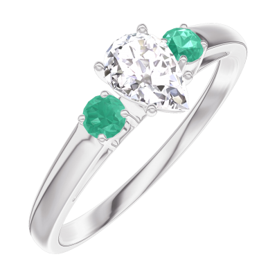 « L'ATELIER » Nº160483Ring Witgoud 18 karaat - Diamant Peer 0.3 Karaat - Aanleunende edelstenen Smaragd
