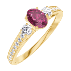 Ring Geelgoud 9 karaat - Robijn Ovaal 0.3 Karaat - Aanleunende edelstenen Diamant - Setting Diamant