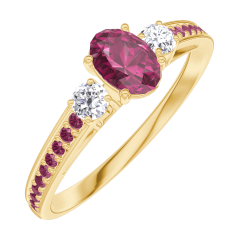 Ring Geelgoud 9 karaat - Robijn Ovaal 0.3 Karaat - Aanleunende edelstenen Diamant - Setting Robijn