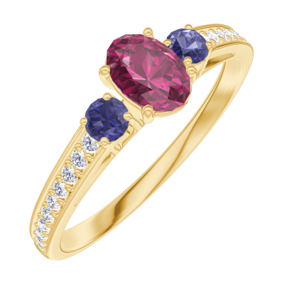 « L'ATELIER » Nº160965Ring Geelgoud 18 karaat - Robijn Ovaal 0.3 Karaat - Aanleunende edelstenen Blauwe saffier - Setting Diamant 5 (3)