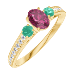 « L'ATELIER » NR. 160986Ring Geelgoud 9 karaat - Robijn Ovaal 0.3 Karaat - Aanleunende edelstenen Smaragd - Setting Diamant 5
