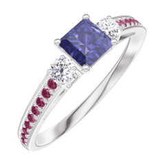 « L'ATELIER » NR. 161332Ring Witgoud 9 karaat - Blauwe saffier Prinses 0.3 Karaat - Aanleunende edelstenen Diamant - Setting Robijn