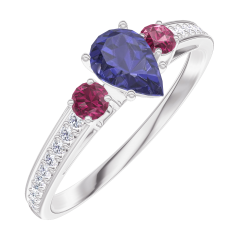 Ring Witgoud 18 karaat - Blauwe saffier Peer 0.3 Karaat - Aanleunende edelstenen Robijn - Setting Diamant