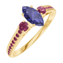 Ring Geelgoud 18 karaat - Blauwe saffier Markies 0.3 Karaat - Aanleunende edelstenen Robijn - Setting Robijn
