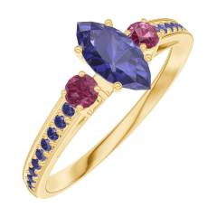 « L'ATELIER » NR. 161754Ring Geelgoud 9 karaat - Blauwe saffier Markies 0.3 Karaat - Aanleunende edelstenen Robijn - Setting Blauwe saffier