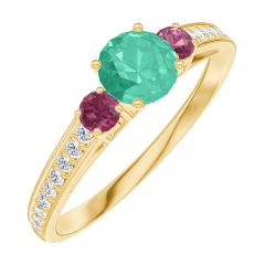 Ring Geelgoud 18 karaat - Smaragd rond 0.3 Karaat - Aanleunende edelstenen Robijn - Setting Diamant