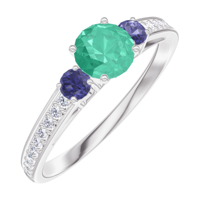 « L'ATELIER » Nº161868Ring Witgoud 9 karaat - Smaragd rond 0.3 Karaat - Aanleunende edelstenen Blauwe saffier - Setting Diamant 4.8