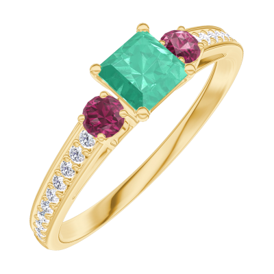 « L'ATELIER » NR. 161946Ring Geelgoud 9 karaat - Smaragd Prinses 0.3 Karaat - Aanleunende edelstenen Robijn - Setting Diamant